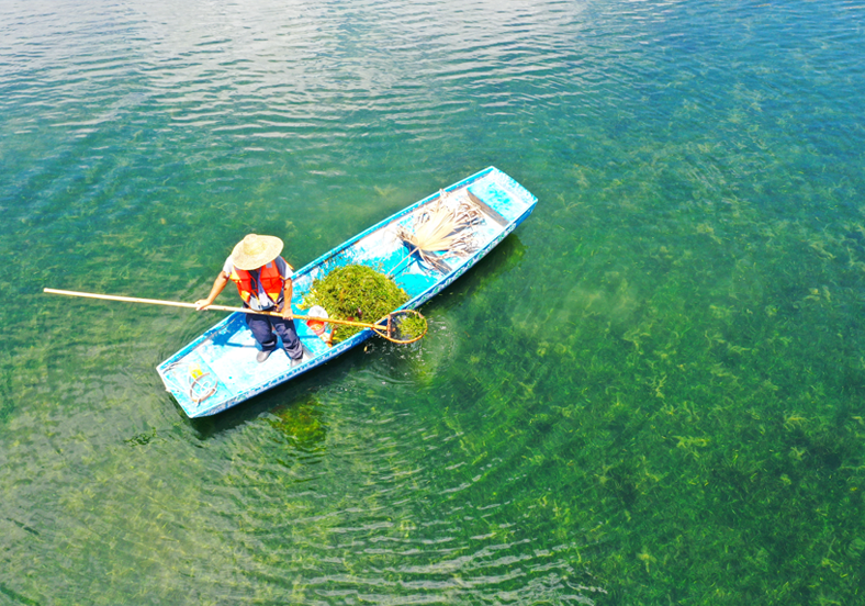 在净化水质方面,沉水植物可通过光合作用向湖水释放大量氧气,且它的整个植株都处于水中,根、茎、叶等都可以吸附水中的营养物,同时吸附重金属元素和一些悬浮物质。